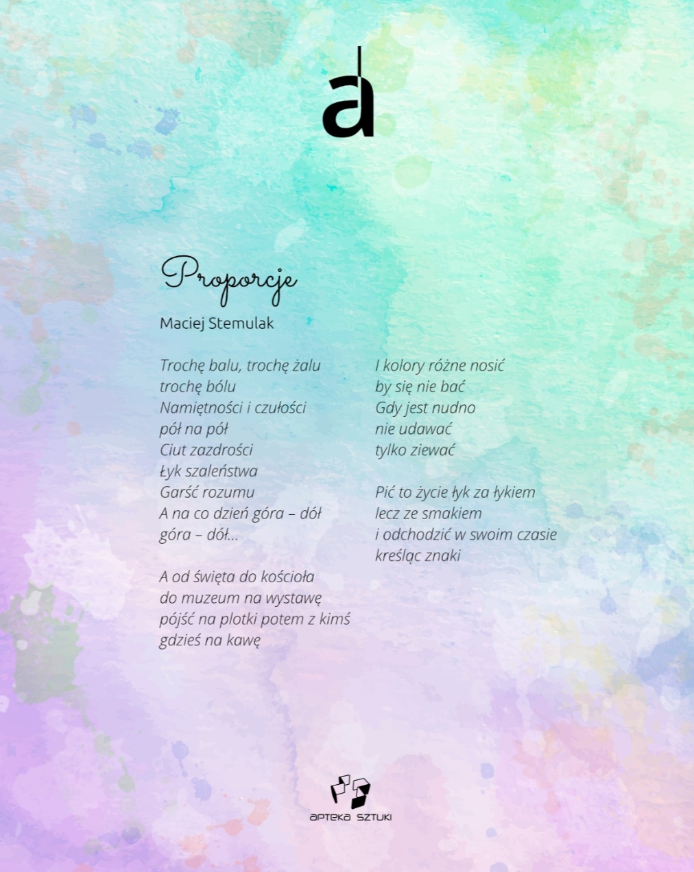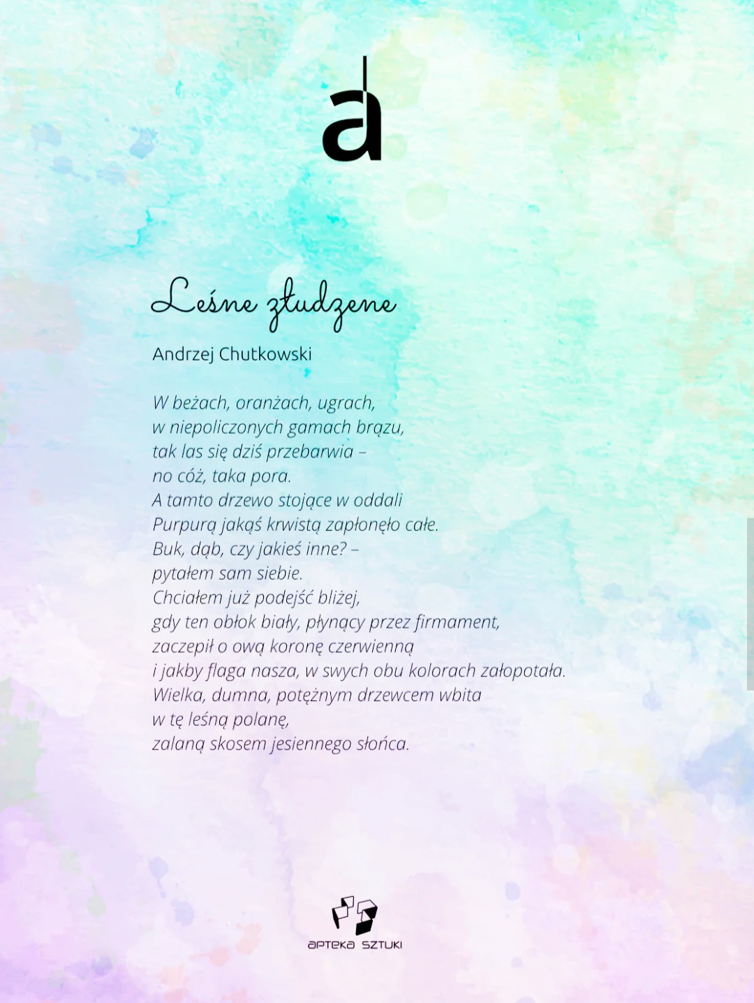 Galeria Apteka Sztuki to jedyny w Warszawie Zakład Aktywności Zawodowej. Dla osób z niepełnosprawnościami aktywizacja zawodowa jest często pierwszym krokiem do samodzielnego, satysfakcjonującego życia. Praca pozwala poczuć się pewniej w świecie niebędącym wolnym od uprzedzeń, nadaje poczucie sensu, jest formą terapii i rehabilitacji społeczno-zawodowej. Dla mnie była to nieustająca terapia sztuką. Kiedyś w tym miejscu mieściła się apteka. Rzeczywiście, Galeria jest jak apteka, w której zamiast leków pojawiła się sztuka. W "Aptece Sztuki" byłam organizatorem cyklicznych wieczorków poetyckich. Zapraszałam gości, umawialiśmy się na próby przed wieczorkami, rozmawialiśmy o poezji, wspólnie przygotowywaliśmy salę i poczęstunek. Wieczorki poetyckie odbywały się co miesiąc, a ich tematyka była związana z takimi uroczystościami, jak dzień zakochanych, pierwszy dzień wiosny lub mikołajki. Gdyby nie Galeria "Apteka Sztuki", nie poradziłabym sobie z wieloma problemami. Praca, sztuka, zawód, pasja i zdolności połączyły się tutaj w jedną całość. Dało mi to poczucie sensu i zarysowało prostą, bezpieczną drogę, dzięki której pokonałam życiowe przeciwności. Galeria na wiele lat stała się moim drugim domem.
